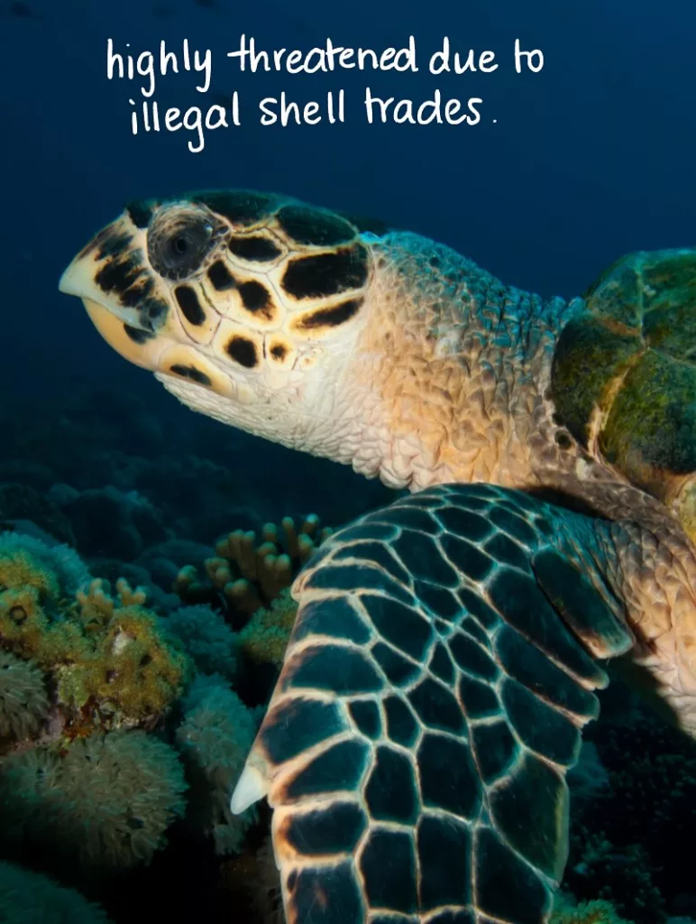 - Critically endangered – Sadly, hawksbills are much rarer than green turtles, making every encounter extra special